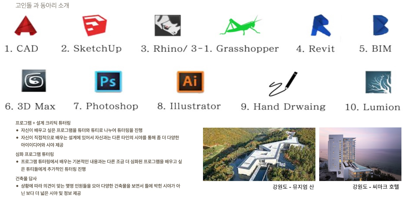 건축학전공 스터디 동아리로 선배 학생들이 후배 학생들에게 다양한 건축지식 및 프로그램 기술을 알려주고 발판이 될 학생 간의 커뮤니티를 조성. - 동아리 활동 내역