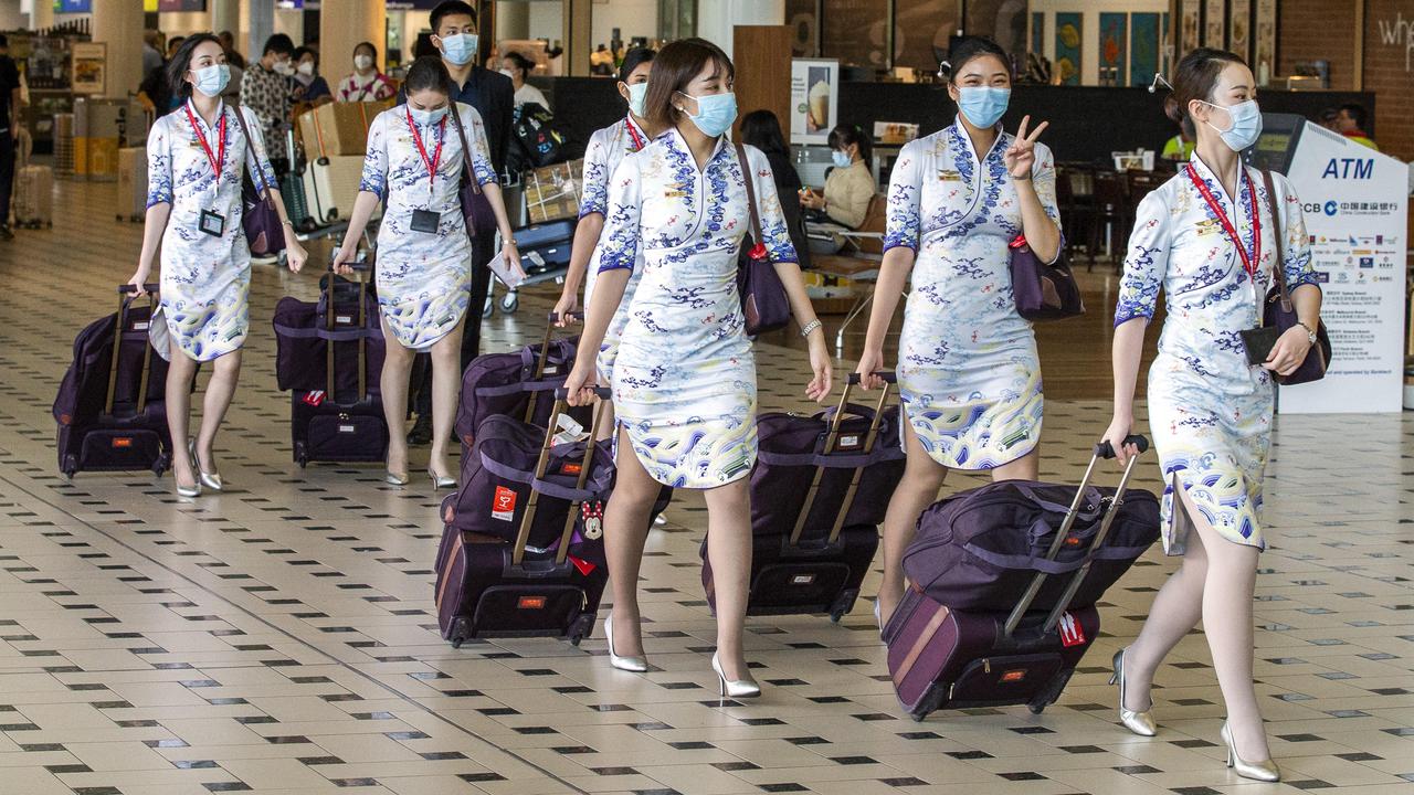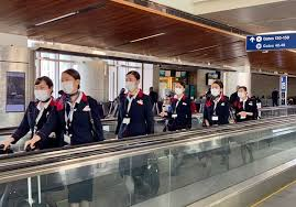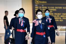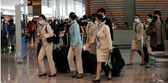 <코로나 바이러스에 적극 예방 위해 항공사 객실승무원 마스크 착용 서비스>