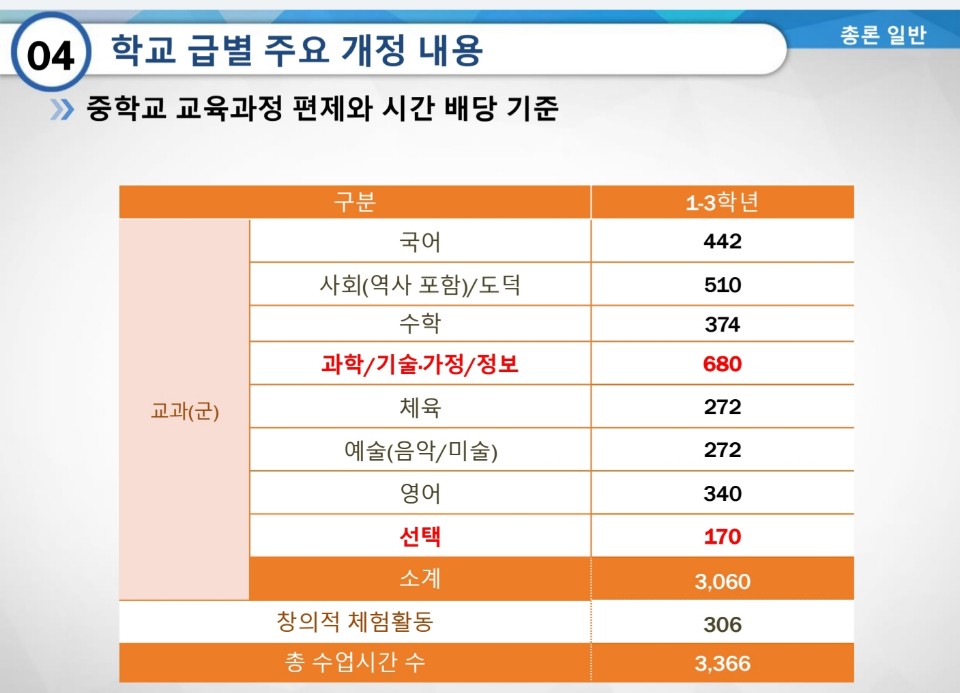 다음의 교육과정 편제와 시간배당을 참고하기 바랍니다.