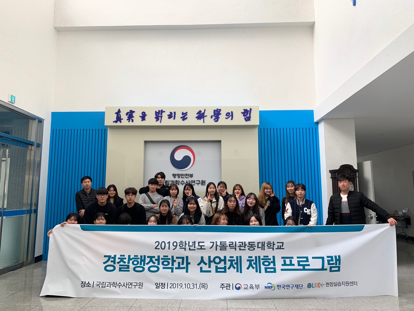 국립과학수사연구원 본관에 들어서니 가톨릭관동대학교 경찰행정학과 학생들의 방문을 환영해주셨습니다.