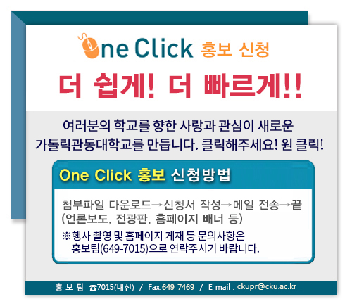fnctId=bbs,fnctNo=414 글번호 5387 [홍보팀] 원클릭홍보신청서 분류 CKU공지 수정일 2022.11.11 작성자 홍보팀 조회수 27362 등록일 2017.06.08 첨부파일 (가톨릭관동대)언론보도 신청서.hwp 바로보기 (가톨릭관동대)전광판홍보신청서.hwp 바로보기 이전글 국립국제교육원 주관, 2017년 교원해외파견사업(중국) 파견자 선발 및 추천 알림 교원지원팀 2017-06-08 00:00:00.0 다음글 2018 평창동계올림픽 VIP 의전 스탭 모집 및 인터뷰 일정 안내 국제교류처 2017-06-08 00:00:00.0 게시물 검색 검색하기 제목 작성자 분류 전체 CKU공지 비교과 현장실습 취업 장학 입학 행사 입찰 채용 국제교류 코로나19 RSS 2.0 12623건, 현재페이지: 1/1263 게시글 리스트 CKU소식 > CKU공지 목록 - 번호,제목,작성자,작성일,조회수,첨부파일 번호 제목 처리상태 작성자 작성일 조회수 첨부파일 12623 가톨릭관동대학교 계약직원 채용 공고(2024. 9. 9. / 9. 19. 임용예정) 대기 소순성 2024.08.14 5104 2 12622 2024학년도 2학기 국가시험지원센터 제3차 정규입실생 모집 공고 대기 정혜영 2024.08.14 3608 1 12621 [펄어비스] 2024 QA 인턴십 모집(~8/26(월)) 대기 취업지원팀 2024.08.13 3591 0 12620 [국립생태원] 2024년 신규직원 채용 안내 대기 취업지원팀 2024.08.13 3020 0 12619 대학일자리플러스센터 뉴스레터 꿈-Tool [No. 25] 2024년 상반기 대기 박제현 2024.08.13 2462 0 12618 [대학일자리플러스센터] C1한 얼음물을 드립니다. 대기 박제현 2024.08.13 2426 0 12617 [강원특별자치도] 면접활동비 지원사업 참여자 모집 안내 대기 유영빈 2024.08.13 2294 1 12616 [교내주차단속팀(총무팀)] 2024학년도 2학기 교내봉사장학생 선발 대기 학생장학복지팀 2024.08.12 2517 1 12615 2024학년도 2학기 교내 국가근로 장학생 모집 안내 대기 학생장학복지팀 2024.08.12 1573 4 12614 2025년 G20 Youth Summit(Y20) 참가 대표단 선발 공고 안내 대기 국제교류처 2024.08.12 2466 3 처음 11263 1 2 3 4 5 6 7 8 9 10 다음 페이지 다음 끝