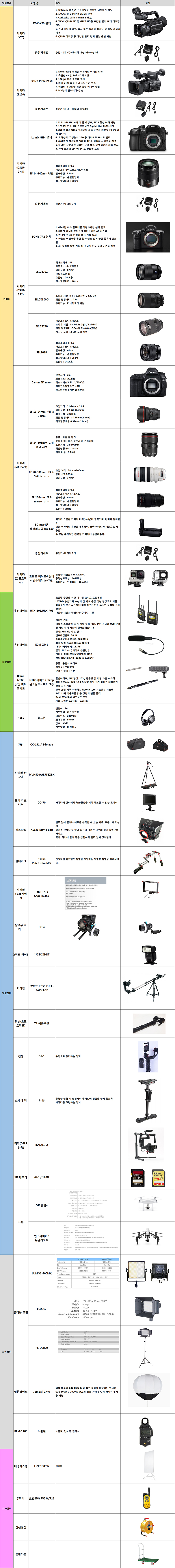 '콘텐츠제작 및 산학협력을 위한 대여장비 목록입니다.' 장비대여 공지 대여 가능 시간 : 월요일 ~ 금요일 09:30부터 16:30까지 ( 12시 ~ 13시, 목요일 제외 ) 장비대여는 스튜디오에서 기자재 대여 신청서 작성 후 대여 가능. 부득이한 사정으로 교수님께 대여 및 반납할 시 담당 조교에게도 필히 연락 바람. 학생들이 원하는 장비가 없을 수도 있으니 문의사항은 담당 조교에게 연락 바람. 반납이 늦어질 시 반납 기재일 2일 전에 연락 바람. 장비 분실 또는 파손 시 담당 조교에게 연락 후 동일한 제품으로 재구매하여 반납할 것. 장비대여 신청서 장비대여 신청서.xlsx