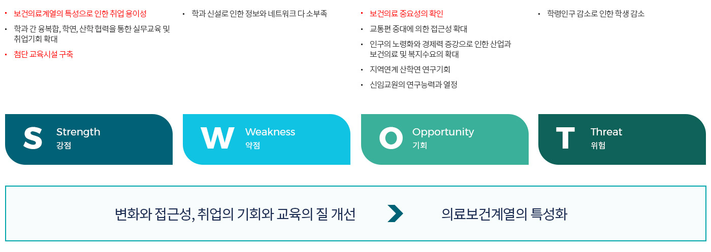 가톨릭관동대학교 헬스케어융합대학 지성적 교양인, 융합적 지식인, 혁신적 창의인, 실천적 전문인 인재상을 실현하기 위해 보건의료과학의 창의실용을 위한 융복합 특성화 교육 실시 진단기기 개발분야 예방 및 치료제 개발 분야 보건의료 데이터 관리 및 활용 빅데이터 활용 진단 광학 장비 개발 바이오에너지, 바이오소재 공학, 발효공학 헬스케어융합대학 발전방향 헬스케어융합대학 특성화(BT-IT-HT 분야 8개 학과) SWOT